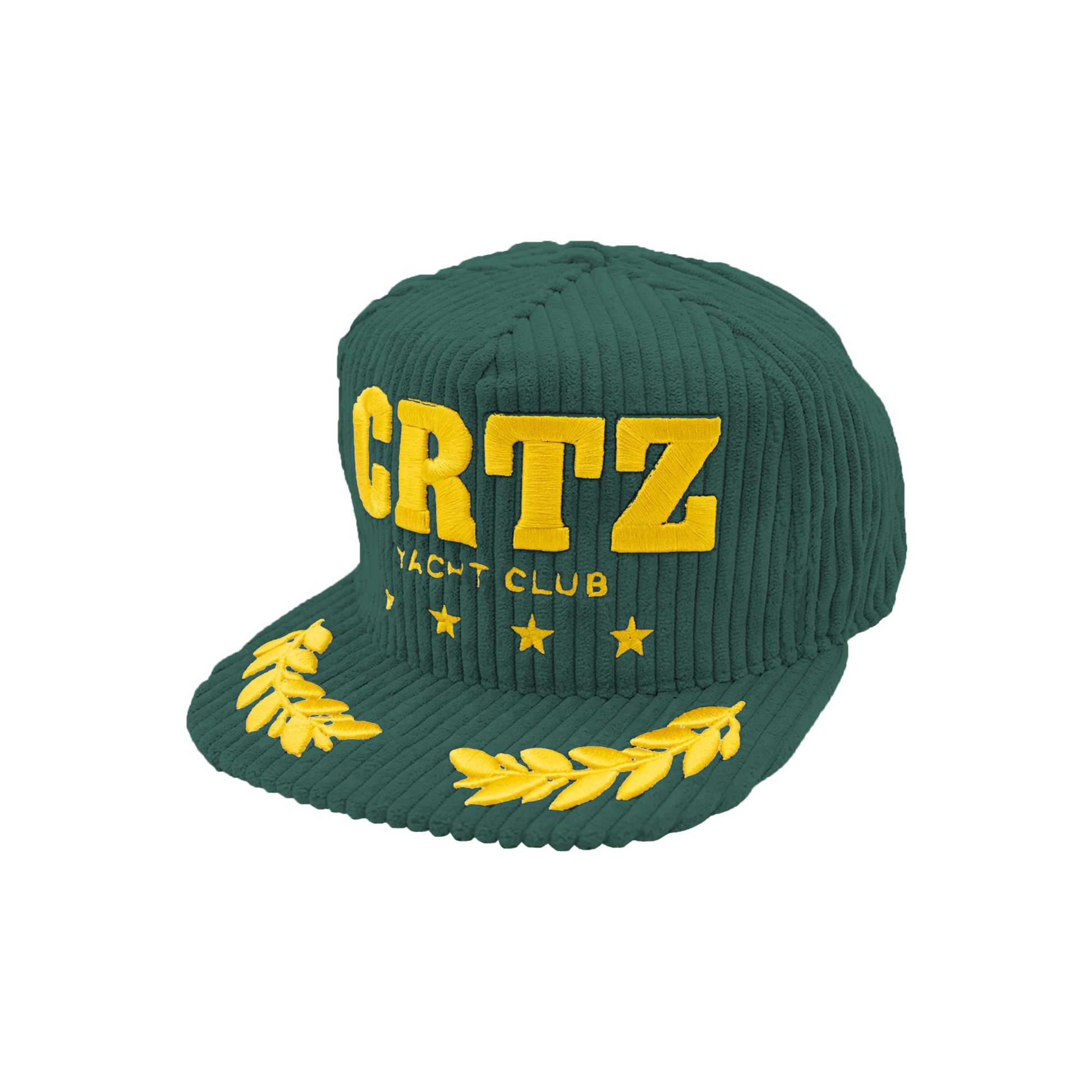 A premium collaboration snapback featuring a rich green corduroy front, expertly paired with bold gold “CRTZ” embroidery across the crown and intricate laurel detailing on the brim. This one size-fits-most structured cap combines sport-luxe yacht‑club flair with Corteiz’s signature streetwear edge.