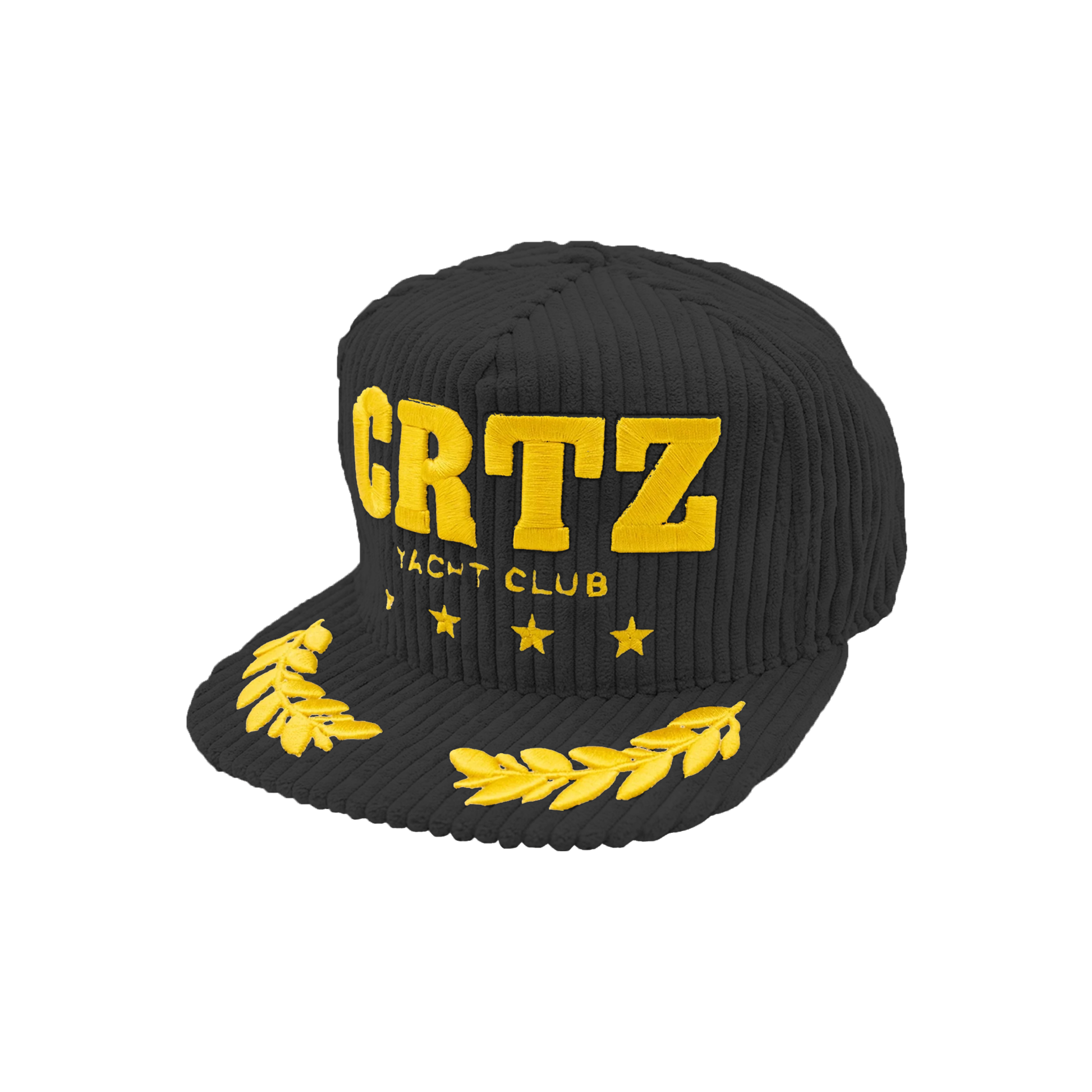 A bold and polished streetwear accessory born from the collaboration between two London-based labels. This version features a rich black corduroy or velour fabric adorned with gold embroidered "CRTZ" lettering across the front and laurel leaf detailing on the brim—evoking yacht‑club prestige with urban edge. It comes in a classic snapback style with an adjustable back strap, ensuring a comfortable, one-size-fits-most fit .
