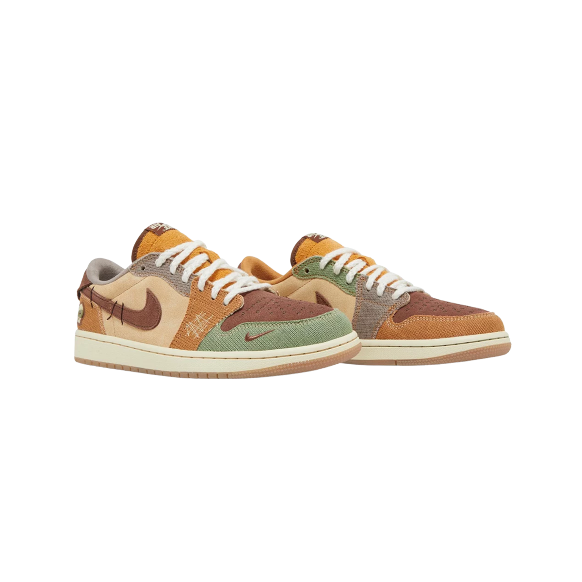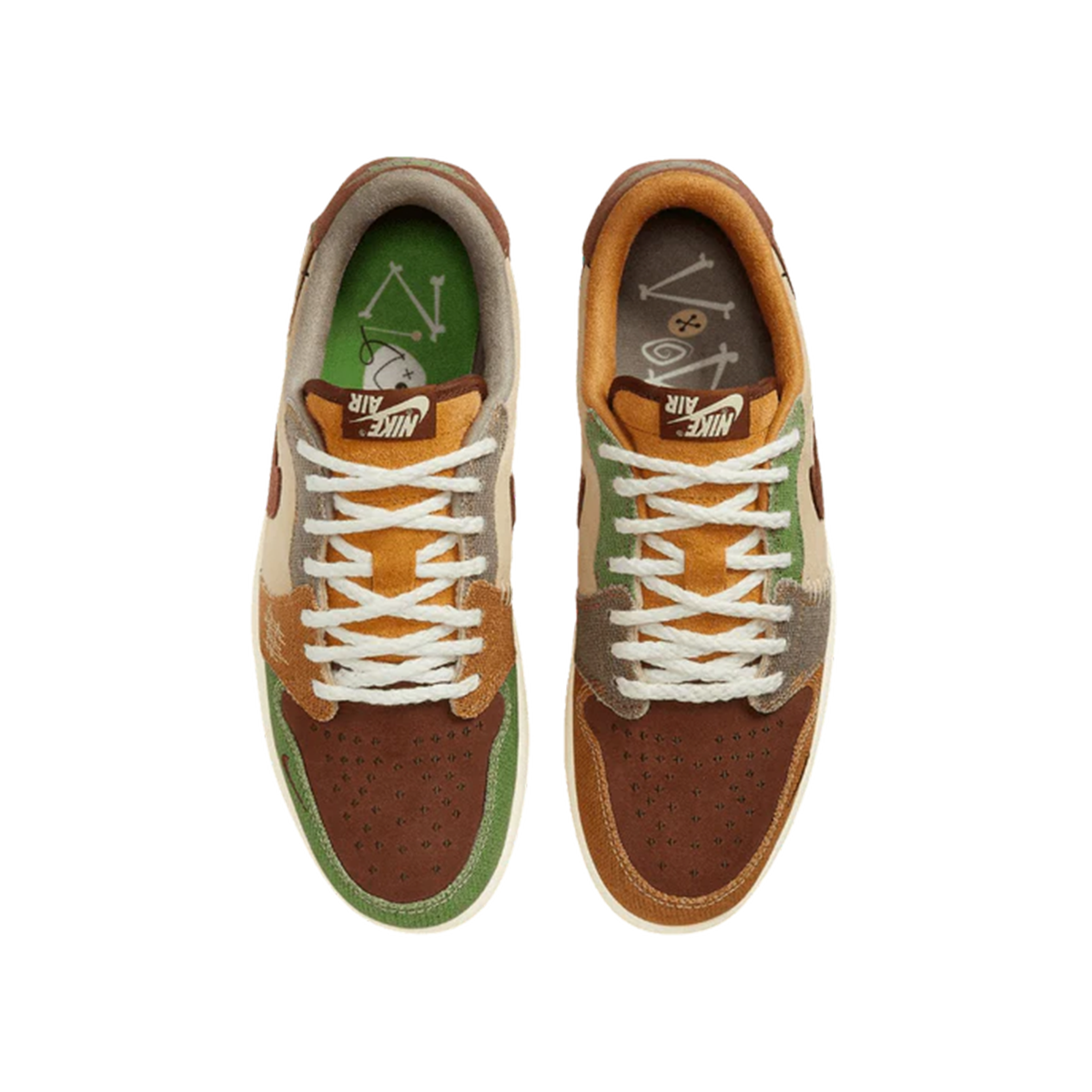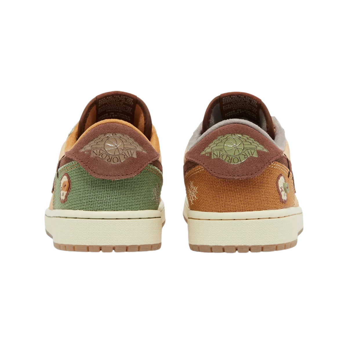 The Air Jordan 1 Retro Low OG Zion Williamson Voodoo is toned in a mixture of different hues, with moon fossil, oil green, flax, muslin fauna, and sesame being the dominant hues.