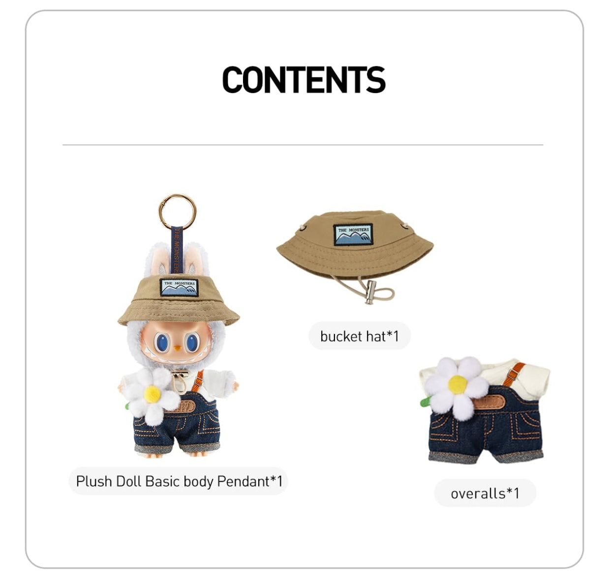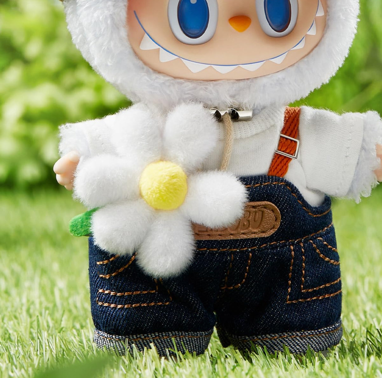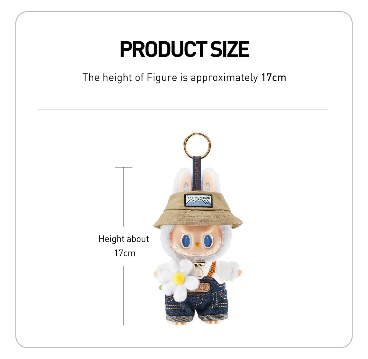 This collectible The Monsters Fall In Wild Vinyl Plush Doll Pop Mart LABUBU features an "in the wild" theme. The doll, which stands almost 16 centimeters tall, features a character wearing denim overalls over a white t-shirt. He also wears work boots and a brown bucket hat with a "The Monsters" logo on the front. The fur on his body, mainly on his arms, around his head, and on his ears, is white plush material, while the face and hands are made of vinyl. The face has big blue eyes and a wide smile with pointy teeth showing.