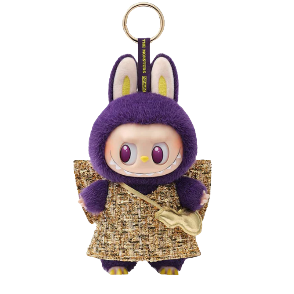 Created by Hong Kong–based artist Kasing Lung, Labubu is a mischievous character from The Monsters, a collection that draws inspiration from Nordic myths. This version of Labubu is part of a collaboration between Pop Mart and Pronounce, featuring soft purple fur and a vinyl face. The Labubu doll comes with removable clothing in metallic gold and angel wings. The toe claws, sharp teeth, and ear details come in a golden-yellow hue. In addition, a gold, violin-shaped accessory stretches across the character’s chest. The plushie is crafted from 66 percent polyester, 9 percent ABS, and 25 percent PVC.