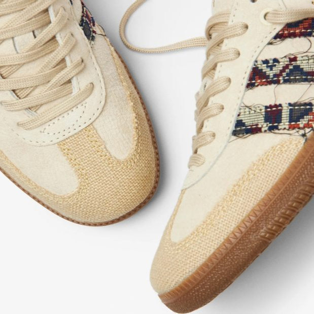 This edition features an ecru suede upper, complemented by a tone-on-tone hemp mudguard. Colorful patterns decorate the three stripes with frayed finishes, as well as the heel tab. Golden branding on the tongue and side panels adds a premium touch to the silhouette, while the whole design is completed with a traditional gumsole.